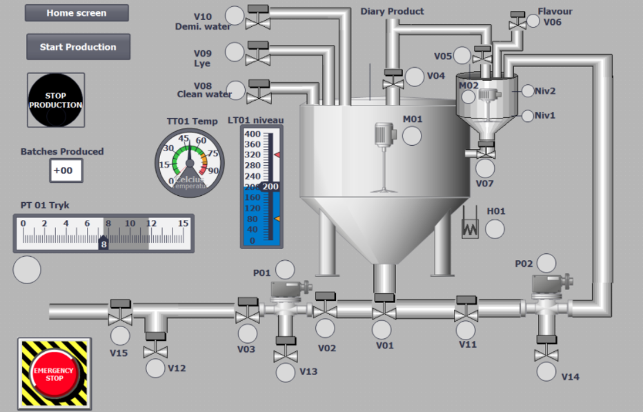 When you choose one of the 3 flavors, the production will run 24/7, regulating analog inputs and outputs, opening and closing a lot of valves in the right order, producing dairy products such as yoghurt, milk, etc.